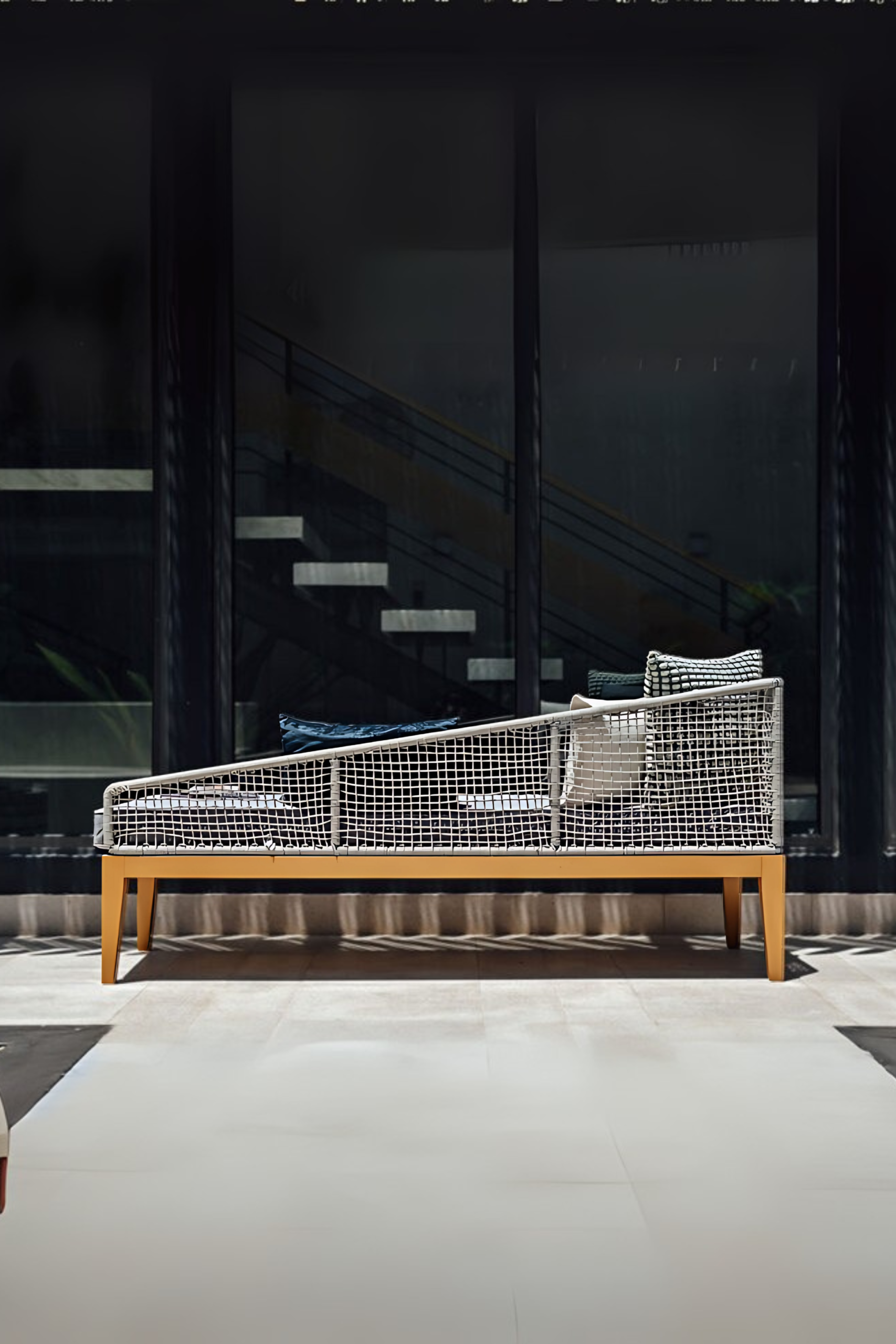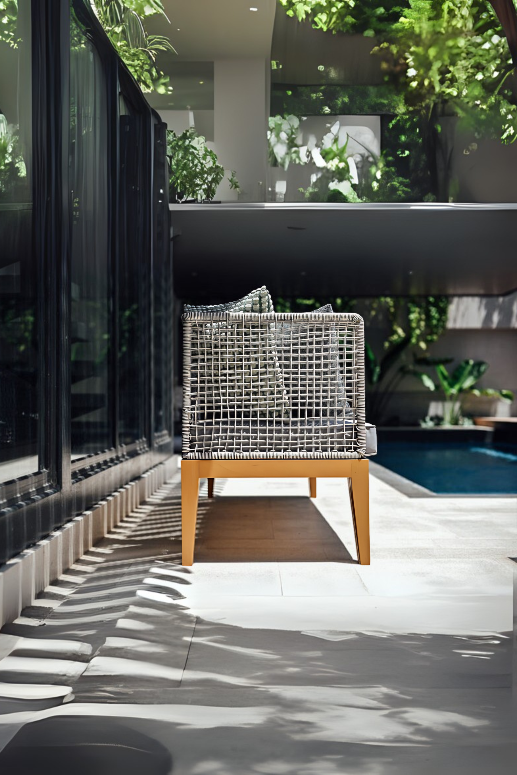 Elevate your outdoor space with our stylish Outdoor DayBed. Crafted from outdoor-grade stainless steel and featuring BSDS (Bina Sohail Design Studio) special exquisite rope weaving, it offers both strength and contemporary charm. The cushions, covered in high-quality outdoor jute fabric, ensure comfort and longevity. Accented with rich Golden Teak, this day bed is the perfect blend of luxury and resilience for your patio or garden.